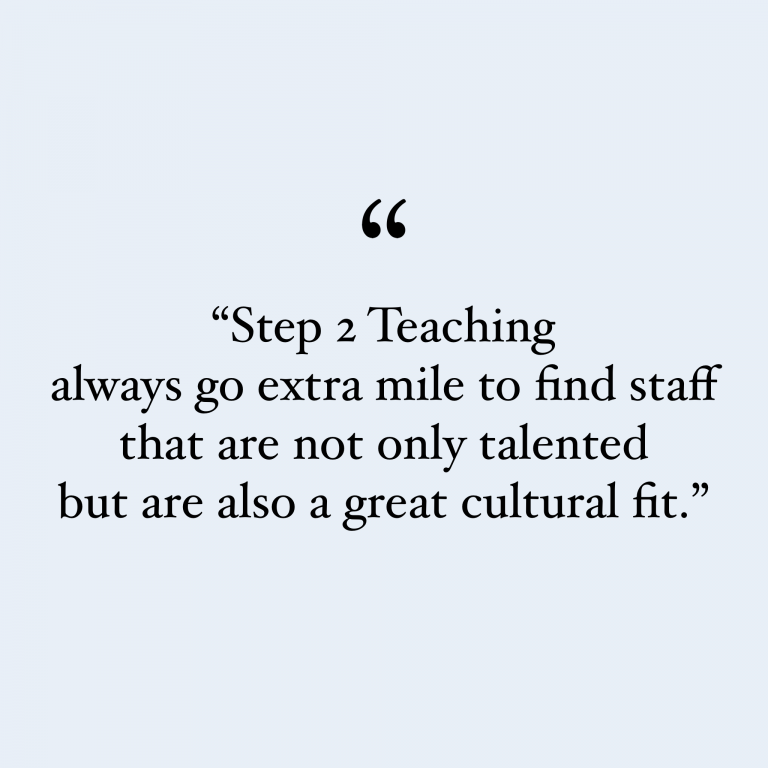 People are at the core of everything we do at Step 2 Teaching. Our approach ensures successful recruitment outcomes and meaningful relationships with our clients that last the test of time; and we are always delighted when former candidates return to us as clients.